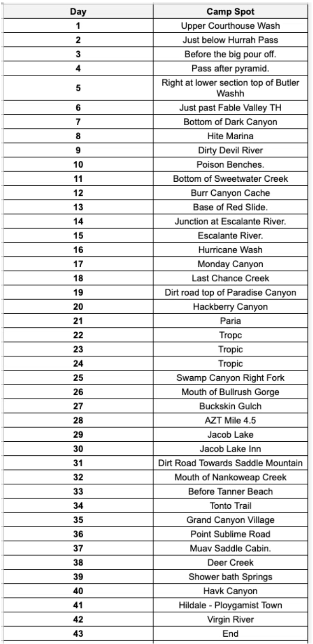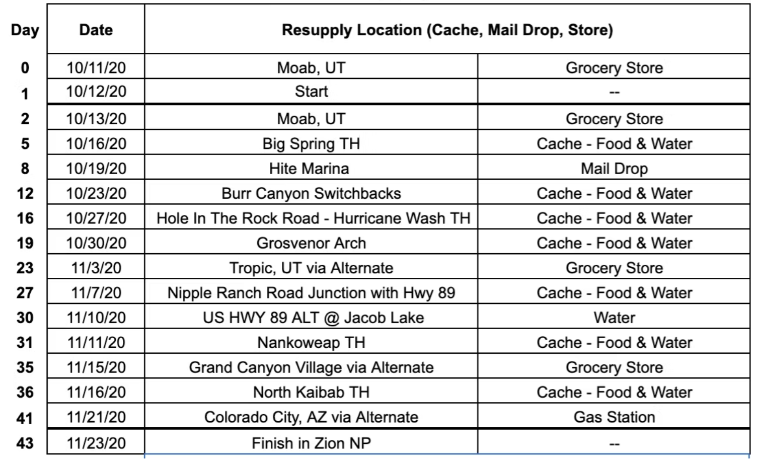 Below is a table that shows where we cached food and water along the route. It details each resupply spot, what we used to resupply and on which day of the trip.