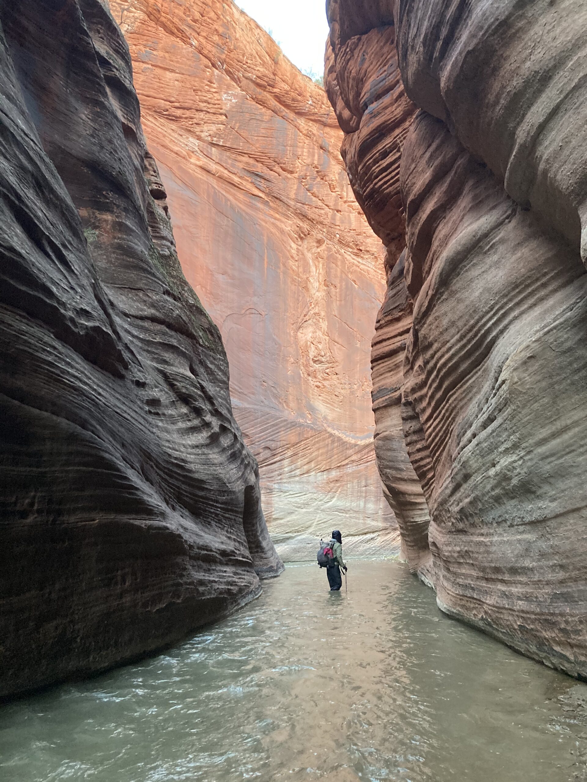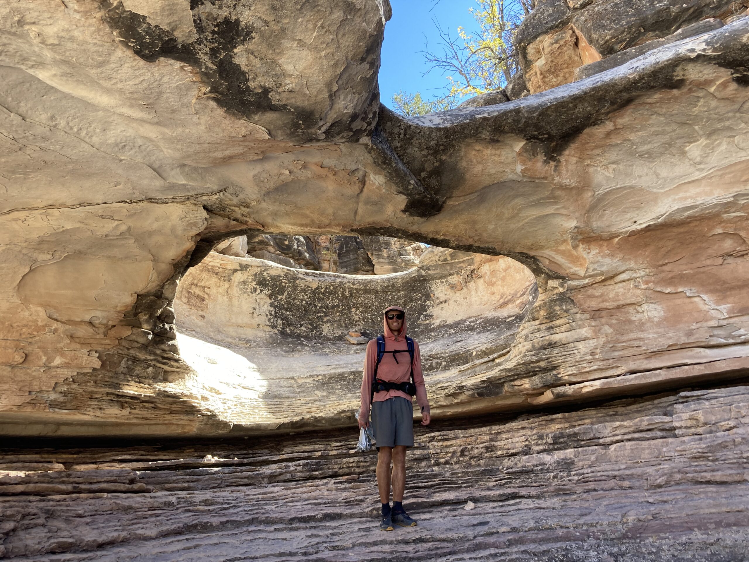 This section of the Hayduke Trail caught us off guard by how stunning it was. We walked into Capitol Reef and through the Burr Canyon switchbacks (the road is incredible). Then, we entered Muley Twist Canyon, which blew our minds. It was one of the first moments for us when we realized just how extensive and winding the canyons really are. It may also have been a highlight for us because the day prior we had run out of food and water for about 7 hours of walking. When we finally reached our cache in Capitol Reef at 8 PM, it was a big relief to resupply. Another highlight was on our journey down Muley Twist Canyon. At this point in the trip, we knew it was unlikely our next planned water at Muley Tanks would be there. Here, we happned to run into a retired backcountry ranger who was out on a personal trip. He told us not to count on many water sources since that area hadn’t seen significant rain at all in the past two years. He pointed us to a few potential spots to look, even though he wasn’t confident we would find much. We checked the first spot, in the shadow of a pour off in a nearby wash, and we found a small green pool! The scenery and our collision with fate in finding water made Muley Twist Canyon a big highlight for us on our Hayduke journey.